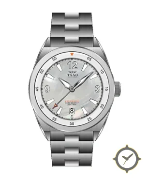 A Sports watch with a vintage-inspired 31mm case, crafted from stainless steel featuring a white dial with a unique mother-of-pearl finish.