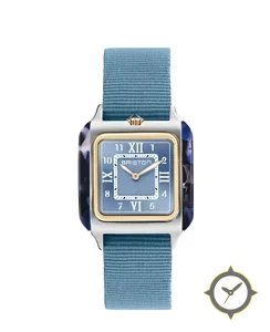 A Dress watch with a vintage-inspired 31.5mm case, crafted from stainless steel featuring a blue dial with a unique guilloche (textured square center) finish.