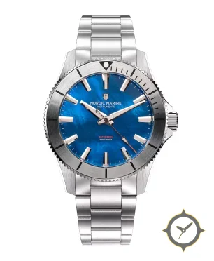 A Dive watch with a vintage-inspired 35.5mm case, crafted from stainless steel featuring a blue dial with a unique mother-of-pearl finish.