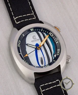 A Dive watch with a versatile 38.5mm case, that suits most wrists, crafted from stainless steel featuring a white dial with a unique multi-layered textured surface with raised wave-like relief finish.