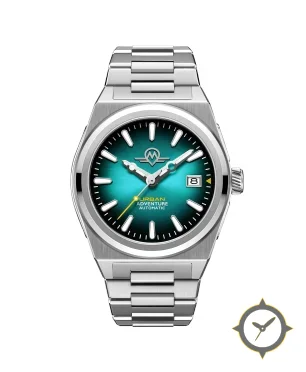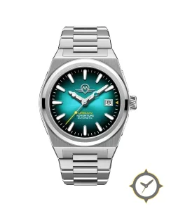 A Sports watch with a bold 42.5mm presence on the wrist, crafted from stainless steel featuring a turquoise dial with a unique sunburst finish.