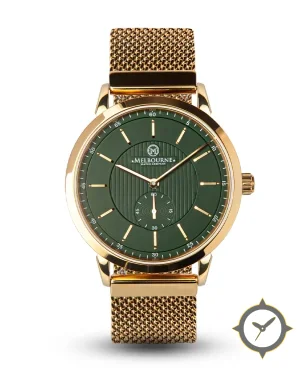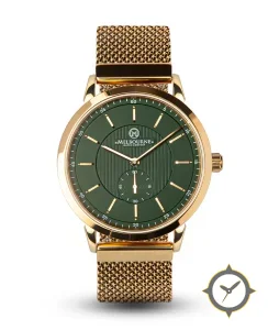 A Dress watch with a bold 45.5mm presence on the wrist, crafted from gold featuring a green dial with a unique matte outer dial with central vertical stripe texture finish.