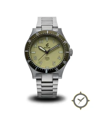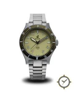 A Dive watch with a vintage-inspired 35.5mm case, crafted from stainless steel featuring a green dial with a unique matte finish.