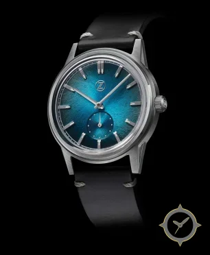 A Dress watch with a bold 42.5mm presence on the wrist, crafted from stainless steel featuring a turquoise dial with a unique sunburst / radial brushed texture with engraved radial streaks finish.