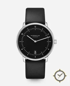 A Minimalist watch with a bold 42.5mm presence on the wrist, crafted from stainless steel featuring a black dial with a unique matte finish.