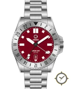 A GMT watch with a versatile 41mm case, that suits most wrists, crafted from stainless steel featuring a crimson dial with a unique textured finish and a true GMT complication for tracking a second time zone.