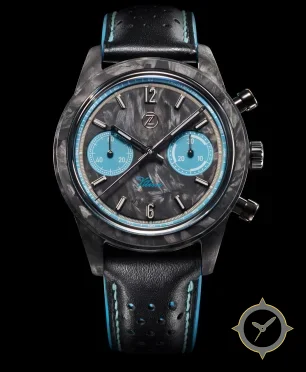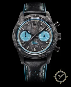 A Chronograph watch with a bold 45mm presence on the wrist, crafted from carbon featuring a gray dial with a unique forged carbon / marbled texture finish.