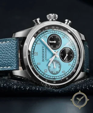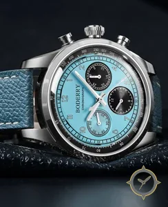 A Chronograph watch with a vintage-inspired 37.5mm case, crafted from stainless steel featuring a turquoise dial with a unique smooth lacquer finish.