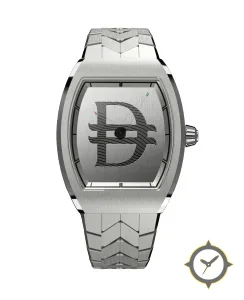 A Luxury watch with a vintage-inspired 35mm case, crafted from stainless steel featuring a silver dial with a unique vertical brushed finish with engraved logo motif finish.