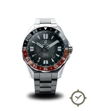 A GMT watch with a versatile 40mm case, that suits most wrists, crafted from stainless steel featuring a black dial with a unique semi-transparent centre with layered 24-hour ring finish and a true GMT complication for tracking a second time zone.