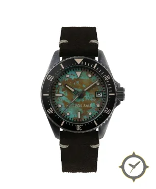 A Dive watch with a versatile 40.5mm case, that suits most wrists, crafted from stainless steel featuring a turquoise dial with a unique oxidized copper patina (distressed/patinated) finish and a true GMT complication for tracking a second time zone.
