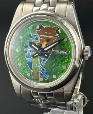 A Sports watch with a versatile 40mm case, that suits most wrists, crafted from stainless steel featuring a green dial with a unique iridescent/abalone mother-of-pearl with cloisonné enamel motif finish.