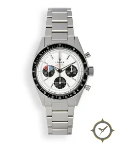 A Chronograph watch with a bold 44mm presence on the wrist, crafted from stainless steel featuring a white dial with a unique lacquer finish.