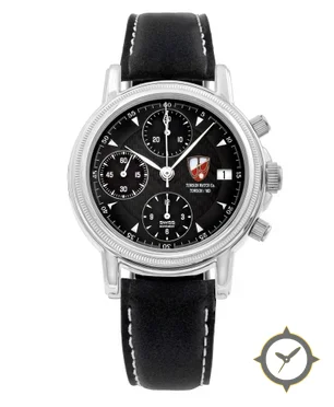 A Chronograph watch, crafted from stainless steel featuring a black dial with a unique textured (subtle guilloché) finish.