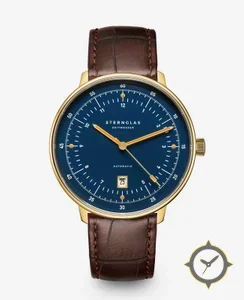 A Dress watch with a vintage-inspired 35mm case, crafted from gold featuring a blue dial with a unique sunburst finish.