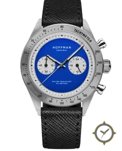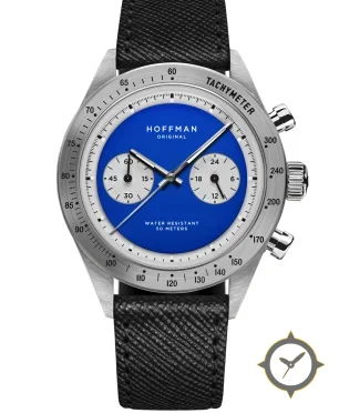 A Chronograph watch with a vintage-inspired 37mm case, crafted from stainless steel featuring a blue dial with a unique lacquer finish.