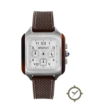 A Chronograph watch with a vintage-inspired 34.5mm case, crafted from stainless steel featuring a white dial with a unique engine-turned guilloché with hobnail center finish.
