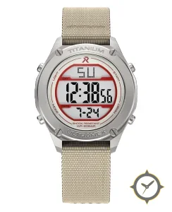 A Digital watch with a bold 51mm presence on the wrist, crafted from titanium featuring a white dial with a unique matte LCD finish.