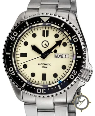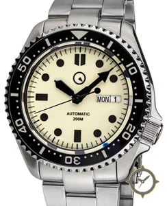 A Dive watch with a bold 50mm presence on the wrist, crafted from stainless steel featuring a white dial with a unique luminous/cream patina finish.