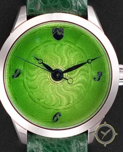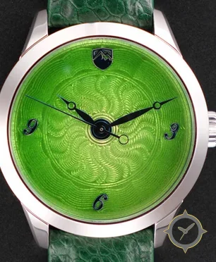 A Dress watch with a vintage-inspired 35mm case, crafted from stainless steel featuring a green dial with a unique guilloché (engine-turned, radiating swirling pattern) finish.