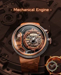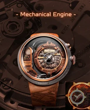 A Skeleton watch with a versatile 38.5mm case, that suits most wrists, crafted from bronze featuring a brown dial with a unique skeletonized with exposed movement and grained metal surfaces finish.