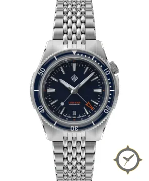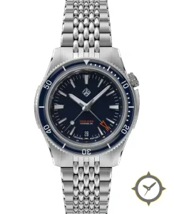 A Dive watch with a vintage-inspired 34.5mm case, crafted from stainless steel featuring a navy dial with a unique sunburst/textured finish and a true GMT complication for tracking a second time zone.