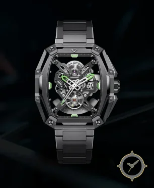 A Skeleton watch, crafted from titanium featuring a black dial with a unique open-worked skeleton / exposed movement finish.