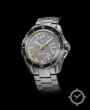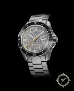 A Dive watch with a bold 45.5mm presence on the wrist, crafted from stainless steel featuring a gray dial with a unique meteorite (Widmanstätten) finish.