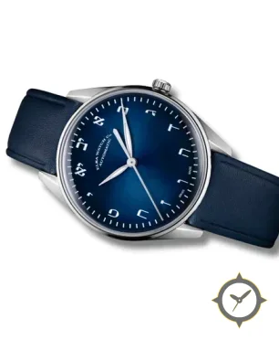 A Dress watch with a bold 42.5mm presence on the wrist, crafted from stainless steel featuring a blue dial with a unique sunburst finish.