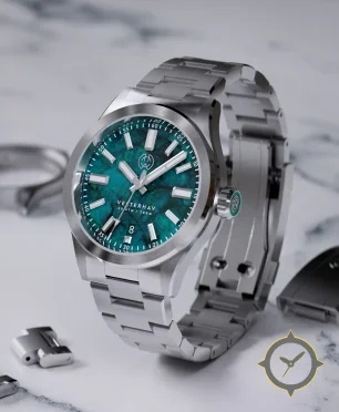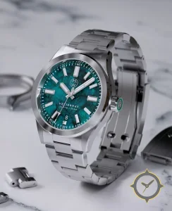 A Dive watch with a bold 42.5mm presence on the wrist, crafted from stainless steel featuring a turquoise dial with a unique marble-like/stone texture finish.