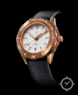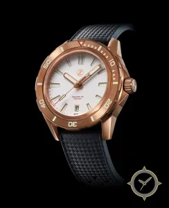 A Dive watch with a versatile 40.5mm case, that suits most wrists, crafted from bronze featuring a white dial with a unique matte finish.