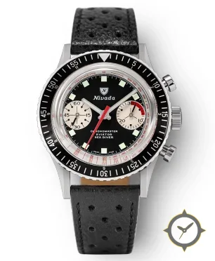 A Chronograph watch with a vintage-inspired 32mm case, crafted from stainless steel featuring a black dial with a unique matte finish.