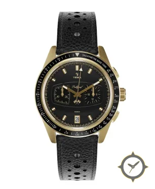 A Racing watch with a versatile 40mm case, that suits most wrists, crafted from gold featuring a black dial with a unique matte with stepped inner section finish.