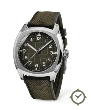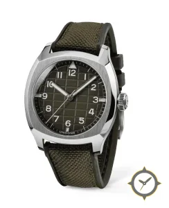 A Field watch with a bold 44mm presence on the wrist, crafted from stainless steel featuring a green dial with a unique waffle/grid texture finish.