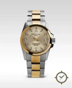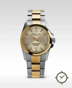 A Dress watch with a vintage-inspired 33.5mm case, crafted from stainless steel featuring a gold dial with a unique sunburst radial guilloché finish.