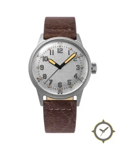 A Field watch, crafted from stainless steel featuring a silver dial with a unique brushed finish.