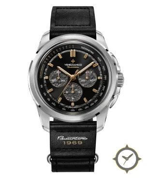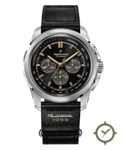 A Sports watch with a bold 46mm presence on the wrist, crafted from stainless steel featuring a black dial with a unique matte black main dial with multi-layer construction and recessed, textured (meteorite-style) subdials finish.