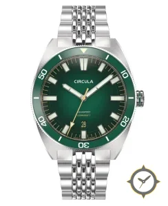 A Dive watch with a vintage-inspired 32.5mm case, crafted from stainless steel featuring a green dial with a unique sunburst gradient finish.