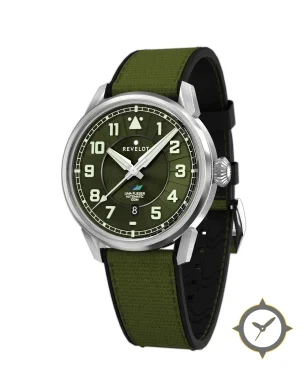 A Pilot watch with a vintage-inspired 34.5mm case, crafted from stainless steel featuring a green dial with a unique sunburst center with matte outer track finish.