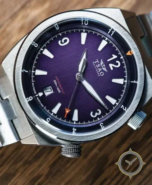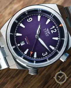 A Dive watch with a bold 44mm presence on the wrist, crafted from stainless steel featuring a purple dial with a unique sunburst / brushed finish.