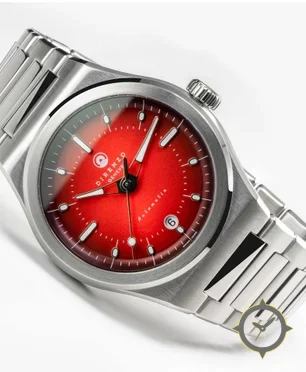 A Sports watch with a bold 46.5mm presence on the wrist, crafted from stainless steel featuring a red dial with a unique sunburst (fumé gradient) finish.