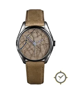 A Minimalist watch with a bold 45mm presence on the wrist, crafted from stainless steel featuring a brown dial with a unique engraved map / relief texture finish.