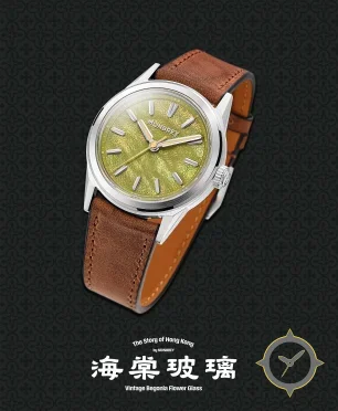 A Dress watch with a versatile 38mm case, that suits most wrists, crafted from stainless steel featuring a green dial with a unique embossed floral (begonia) glass texture finish.