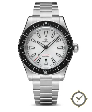 A Dive watch with a vintage-inspired 33.5mm case, crafted from stainless steel featuring a white dial with a unique lacquer finish.