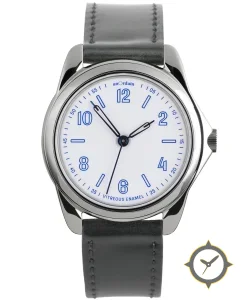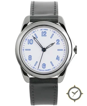 A Dress watch with a vintage-inspired 33.5mm case, crafted from stainless steel featuring a white dial with a unique vitreous enamel, glossy finish.