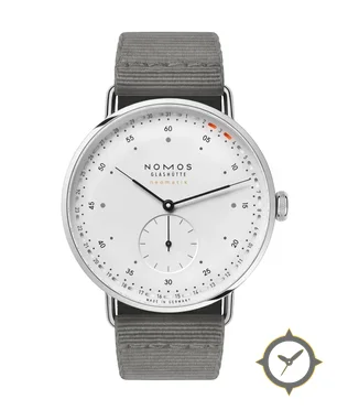 A Minimalist watch with a bold 47mm presence on the wrist, crafted from stainless steel featuring a white dial with a unique matte lacquer finish and a helpful power reserve indicator.
