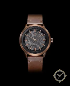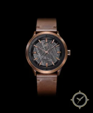 A Vintage watch with a vintage-inspired 36mm case, crafted from bronze featuring a gray dial with a unique meteorite (Widmanstätten) texture finish.