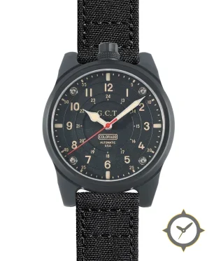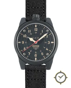 A Military watch with a vintage-inspired 36mm case, crafted from stainless steel featuring a black dial with a unique matte grained finish.