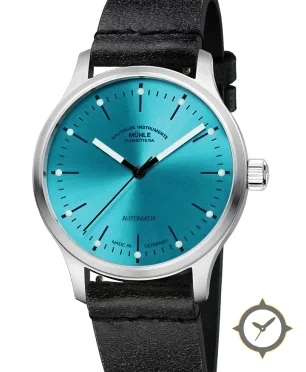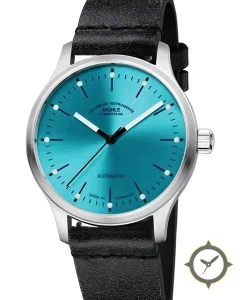 A Minimalist watch with a vintage-inspired 35mm case, crafted from stainless steel featuring a turquoise dial with a unique radial sunburst finish.