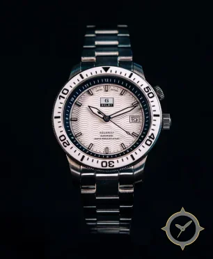 A Dive watch with a vintage-inspired 37mm case, crafted from stainless steel featuring a white dial with a unique wave texture (wavy lines) finish.